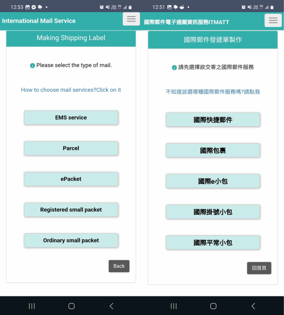So, “EMS Service” is the 「國際快捷郵件」 (international courier mail), but obviously you already knew that as a foreigner who knows all possible acronyms in English. This is the quickest option. Next is 「國際包裹」 (international parcel), which is slightly slower, but you can choose from airmail/shipping/land route, depending on cost. The next options are for smaller mail packets (limited to 5 kinds of items and under 2 kg).