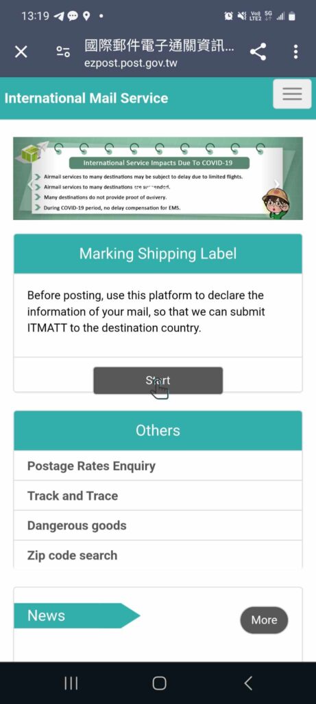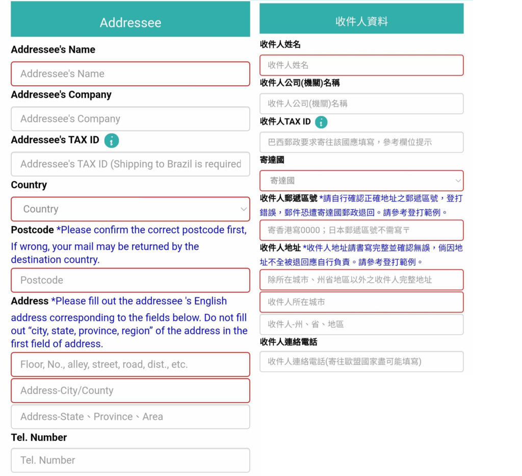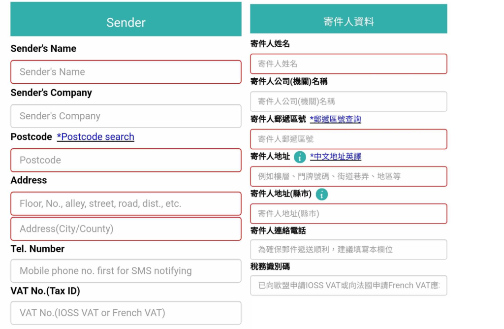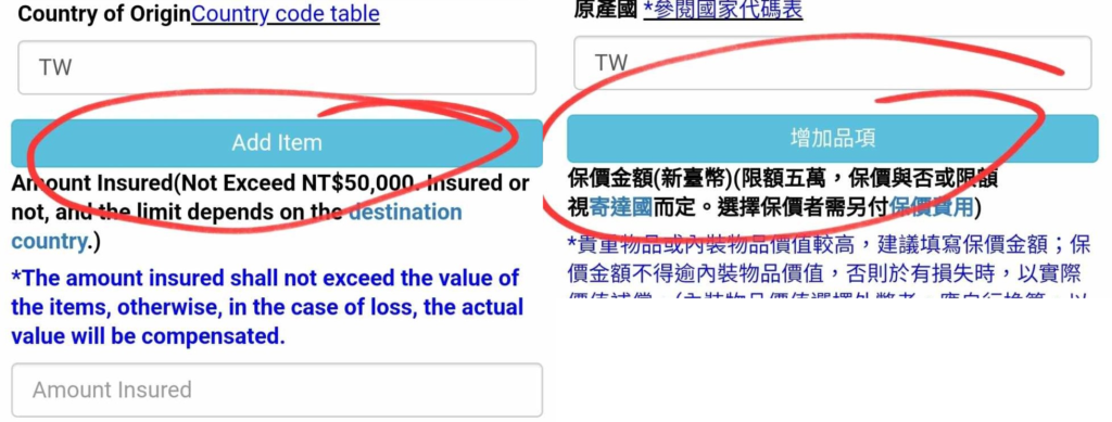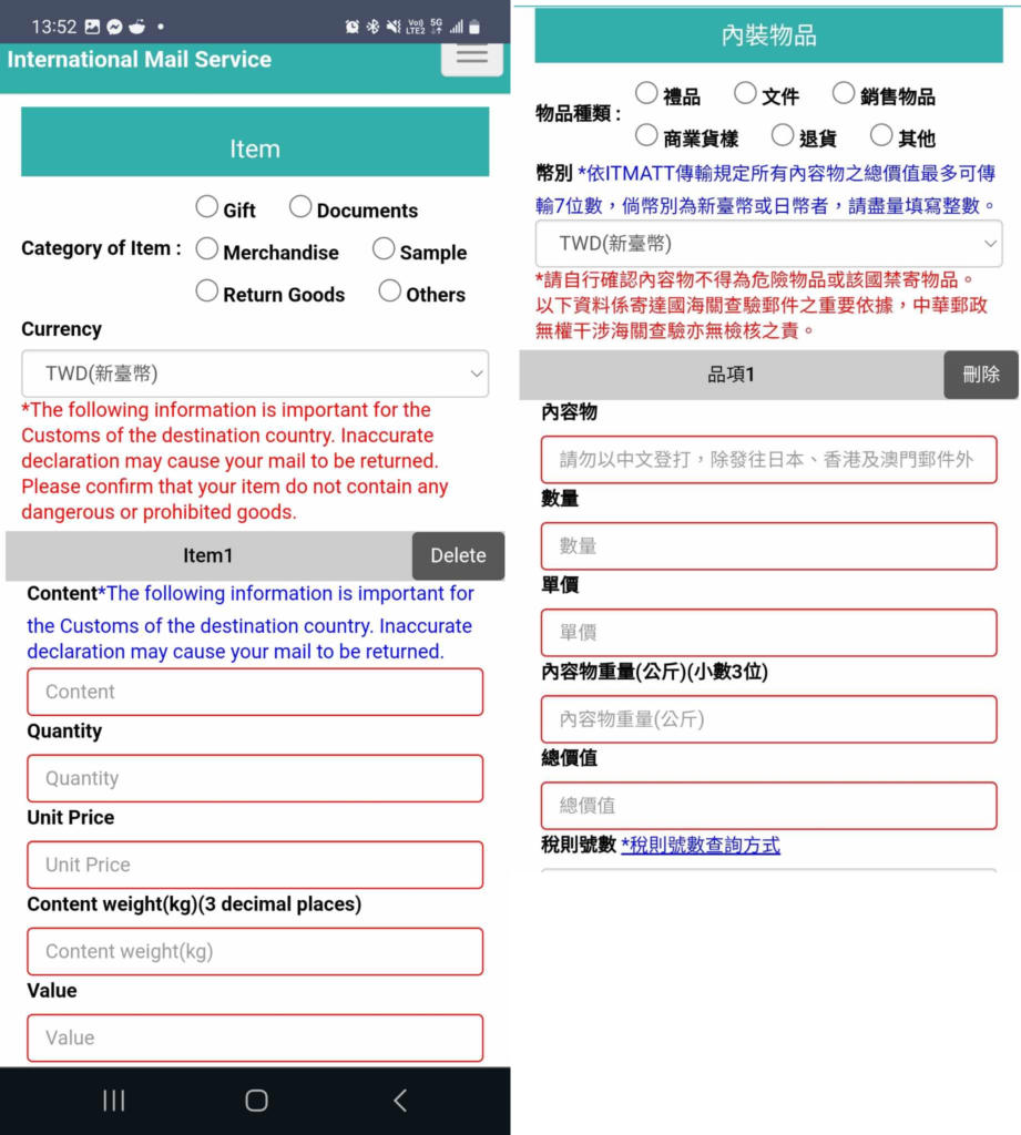 • A note of the items by type/class you intend to send (specifying quantity, unit price and weight for each class of item in kilograms to 3 decimal places at most. (eg. Toys, 3 units, single unit price: NT$1000, collective weight: 0.502 kg (remember the 0 before the point or it won’t be accepted); Clothing, 5 units, single unit price NT$360, collective weight: 1.100 kg)
