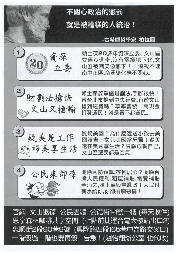 1. Seasoned legislator: Lai Shyh-bao has been a legislator for over 20 years, in which time transportation in the Wenshan District hasn’t improved, electric cables haven’t been put underground, and Wenshan has been mocked as the countryside!! He’s ignored southern Zhongzheng District, and doesn’t care about the changes affecting local businesses.