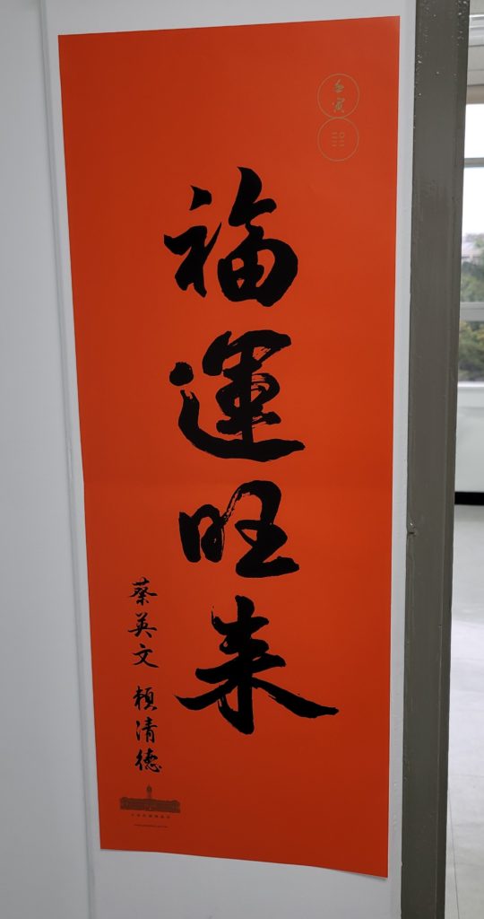 This couplet was distributed by Taipei Mayor Ko Wen-je (柯文哲), chair of the Taiwan People’s Party, and it was one of the main rivals to the one issued by President Tsai Ing-wen and Vice President Lai Ching-te. If you’re a Ko-fen (柯粉/a fan of Ko Wen-je) or just fancy a few political discussions in your lobby with neighbours of different political stripes, you can print it yourself at the Taipei City gateway here. The Chinese word for “tiger” (虎 hu3) is a near-homonym for 「褔」 (good fortune/fu2), especially in Taiwanese-accented Mandarin (台灣國語) in which the “h” sound is often pronounced as “f”. So this couplet is a play on this, with the first two characters having the dual meaning of “tiger pouncing” and “a jump in wealth.”